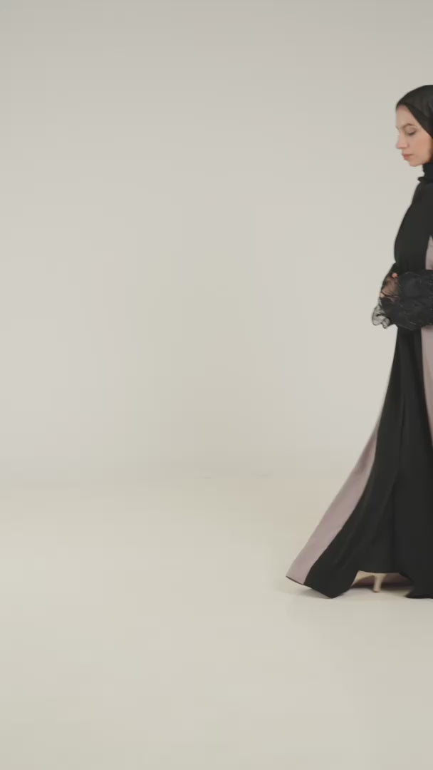عباية راقية تمزج بين التباين العصري والتواضع الخالد. تتدفق اللوحة السوداء المركزية بسلاسة إلى الستائر الجانبية ذات اللون الرمادي الناعم، مما يخلق تأثيرًا أنيقًا ثنائي اللون. يبرز تطريز الدانتيل الأسود المعقد الأكمام الواسعة، مما يضيف لمسة رقيقة من الأنوثة. مثالية للارتداء في النهار والمساء، توفر هذه العباية الرقي مع التفاصيل الدقيقة.