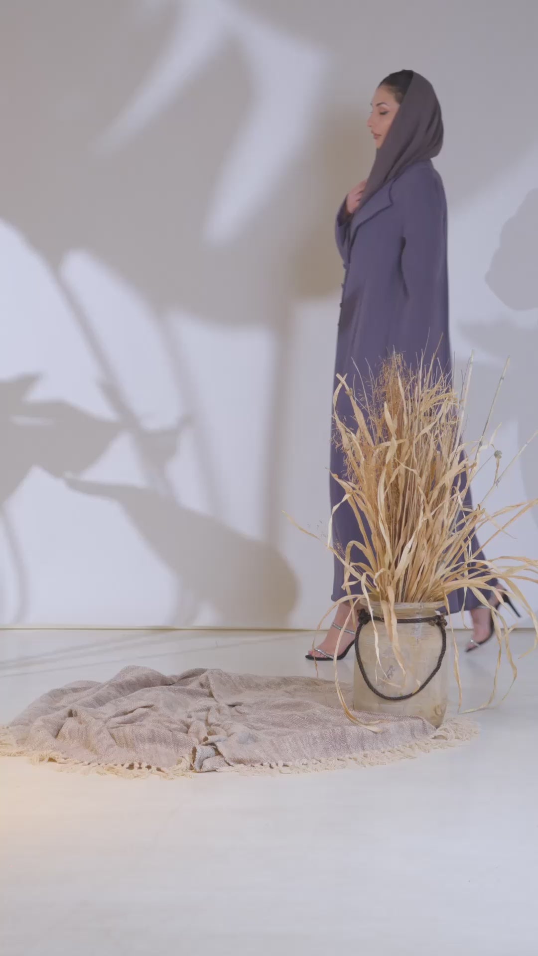 عباية راقية وبسيطة مصنوعة من اللون البنفسجي الغني، ومصممة بطية صدر أنيقة ومصممة خصيصًا لرفع مستوى الصورة الظلية الكلاسيكية. تضيف الأزرار المغطاة بالقماش أحادية اللون لمسة من الأناقة الخالدة، بينما يضفي الغطاء المرفق لمسة عصرية ومتواضعة. ثنياته السائلة وخطوطه الواضحة تجعله مثاليًا للمناسبات الرسمية أو نزهات المساء أو الارتداء اليومي المرتفع.