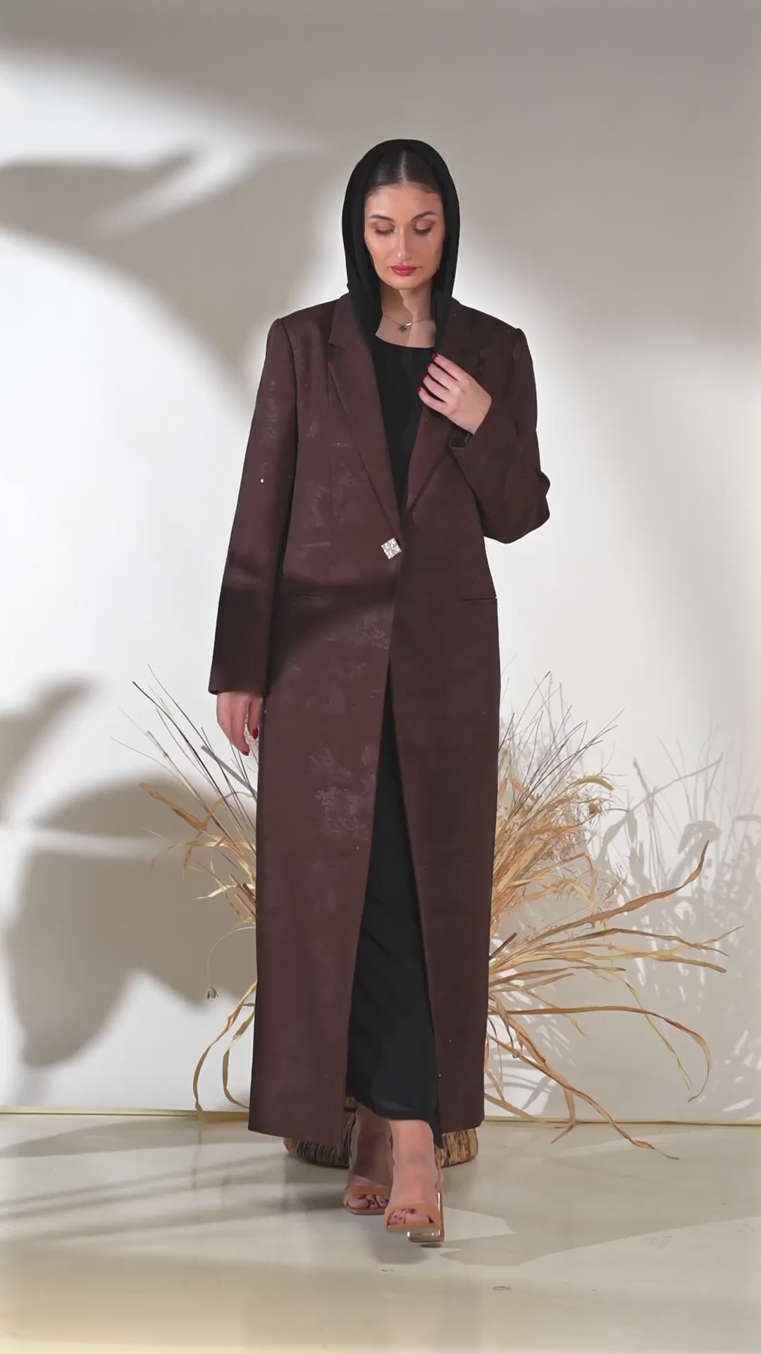 تمزج عباية Cocoa Tailored Blazer بين الأناقة المنظمة والبساطة العصرية، وتتميز بتصميم حاد مستوحى من السترة بلون بني غني. يتم تعزيز الملمس الرقيق في جميع أنحاء القماش بواسطة زر كريستالي واحد، مما يخلق مظهرًا أنيقًا مثاليًا للتجمعات الرسمية والملابس النهارية المتطورة. شيلا مطابقة تكمل هذه المجموعة المتواضعة المصقولة.