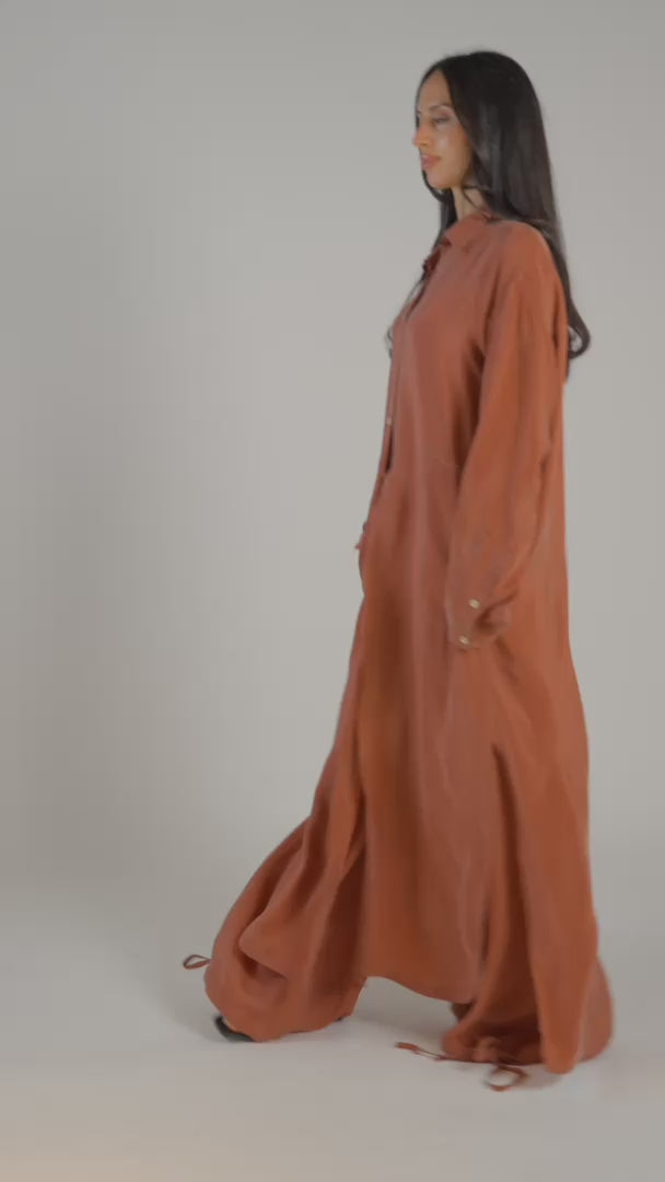 تمزج عباية Terracotta Ease بين الراحة والرقي غير الرسمي مع قصة مريحة ومعاصرة. مصنوع من قماش سائل بلون ترابي دافئ، ويتميز بياقة على شكل قميص، وأزرار أمامية، وتفاصيل دقيقة للجيب للحصول على مظهر جمالي مريح وراقي. تضيف الحاشية ذات الرباط لمسة عصرية، وتوفر تصميمًا قابلاً للتعديل من أجل تنوع سهل من النهار إلى المساء.