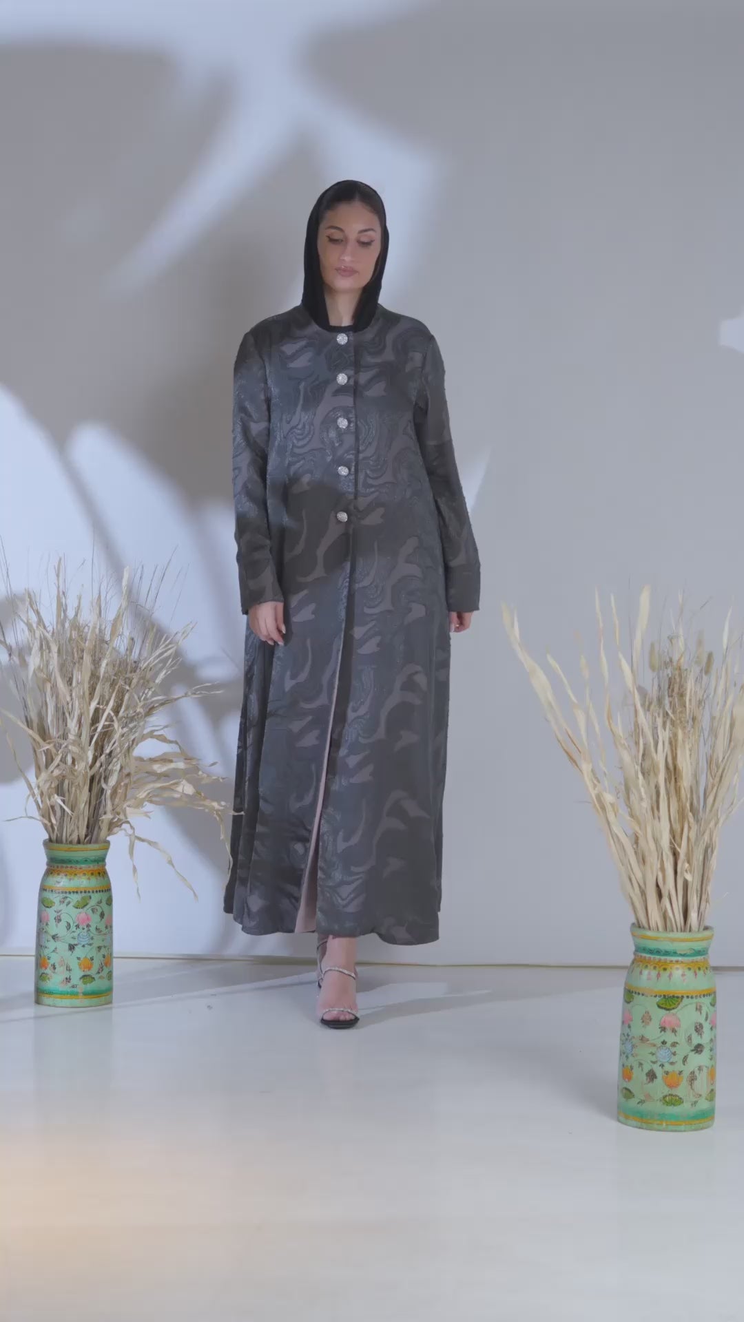 تتميز هذه العباءة الأنيقة المصنوعة من قماش الجاكار باللون الرمادي الفضي بنمط دوامي فاخر وأزرار معدنية مميزة، مما يخلق صورة ظلية راقية ومتطورة. تصميمه المنظم والمتدفق يجعله مثاليًا للنزهات الأنيقة أو المناسبات الخاصة أو التصميم اليومي المصقول. يمنحها الملمس الغني واللمعان الخفيف لمسة نهائية خالدة مستوحاة من الأزياء الراقية ومثالية لخزائن الملابس الحديثة والمتواضعة.
