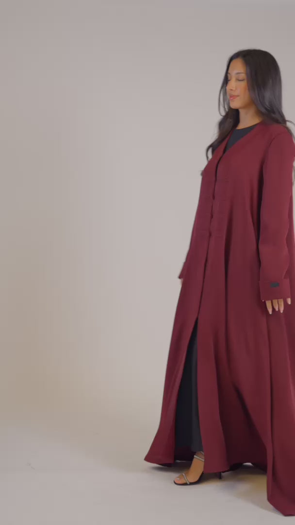القص: عباية بقصة مستقيمة مع تدفق كامل الطول وتفاصيل أمامية منظمة.