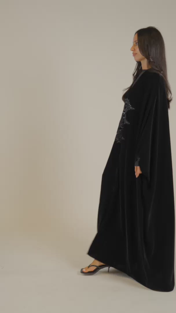 تنضح عباية Velvet Majesty بالرقي والفخامة، وهي مصنوعة من المخمل الفاخر مع زخارف مطرزة معقدة على طول الجهة الأمامية. يضفي ملمسه الناعم وثنيه السائل حضورًا ملكيًا في أي مناسبة، بينما تضيف التفاصيل البسيطة العمق والأناقة. مثالية للتجمعات المسائية أو المناسبات الرسمية، تمزج هذه العباءة بين الفخامة الكلاسيكية والأسلوب المتواضع المعاصر.