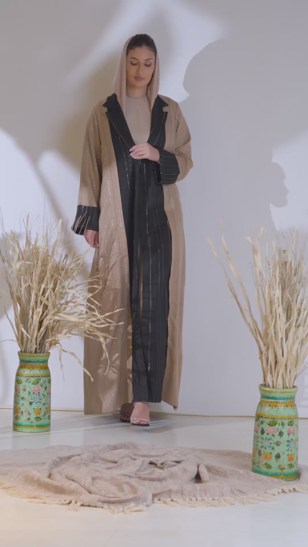عباية عصرية وأنيقة مصنوعة من قماش من مزيج الكتان باللون البيج الدافئ، وتتباين مع لوحة مركزية مقلمة باللون الأسود المذهل ولمسات الأساور المطابقة. يضيف تصميم طية الصدر المدببة لمسة من الرقي المصمم، مما يجعل هذه القطعة مثالية للنزهات النهارية الأنيقة، أو أناقة ملابس العمل، أو إطلالات المساء البسيطة.