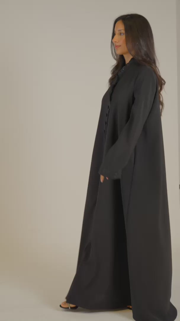 Asymmetric Lace-Trim Black Abaya with Diagonal Button Detailing