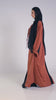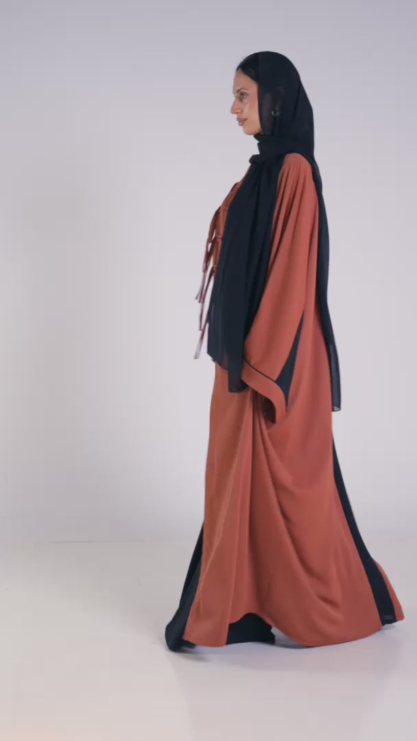A modern abaya that blends timeless modesty with clean, architectural design. Its defining feature is the row of front loop-and-tie accents, giving it a structured yet graceful character. The soft clay hue is contrasted by a flowing black inner panel and matching black scarf, creating a striking two-tone balance. The wide sleeves fall with ease, while tailored cuff details add a subtle finish. Elegant and versatile, this piece moves seamlessly from everyday sophistication to evening refinement.