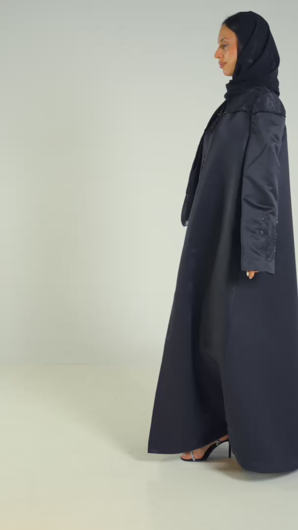 This elegant black abaya features a refined front button design that adds structure and sophistication to its flowing silhouette. The delicate lace accents on the shoulders elevate the look with a touch of femininity and texture. Perfect for formal gatherings or everyday elegance, this abaya blends classic modest style with luxurious detailing.