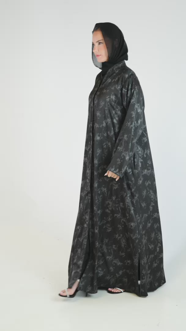 Charcoal Satin Classic Abaya Floral Printed Design