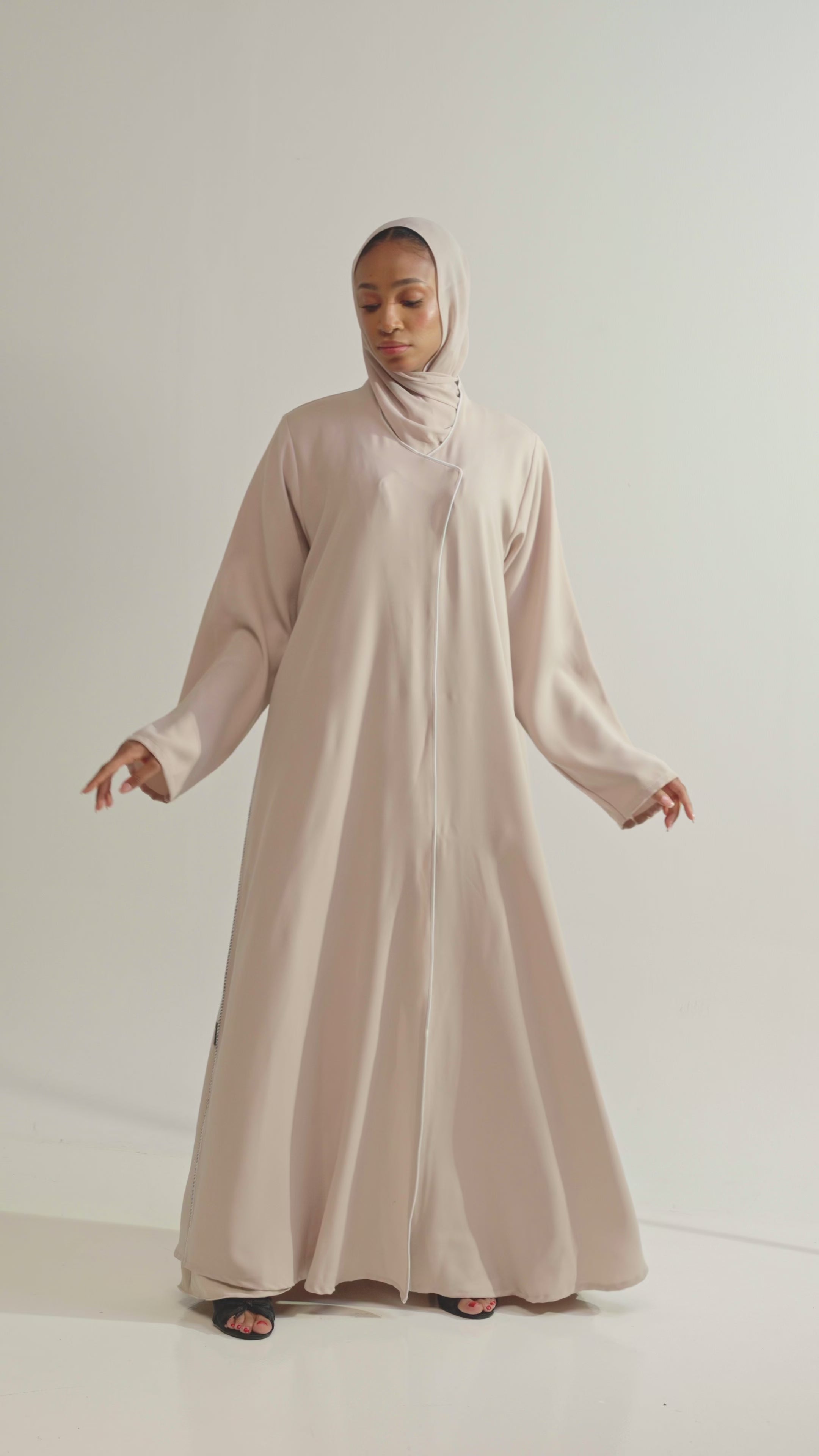 Cut: Floor-length abaya with clean straight cut, long sleeves, mandarin collar, and contrast piping along the front opening.