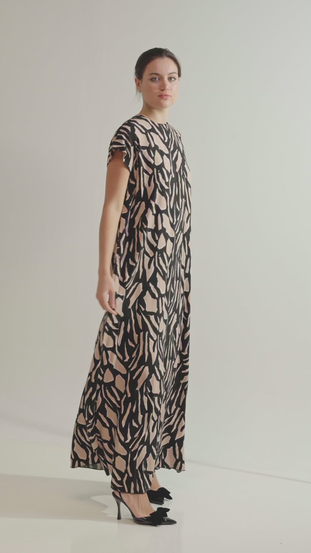 This Dress redefines bold modest fashion with its all-over abstract print in contrasting sand and deep black hues. Designed in a flowing, breathable cut, it features short sleeves and a seamless front for a contemporary, easygoing look. The back sports a vivid orange ABAY. label stitched at the center, serving as a bold branding accent. Perfect for daytime expression or artful evening styling, this dress merges street-style energy with elevated edge.