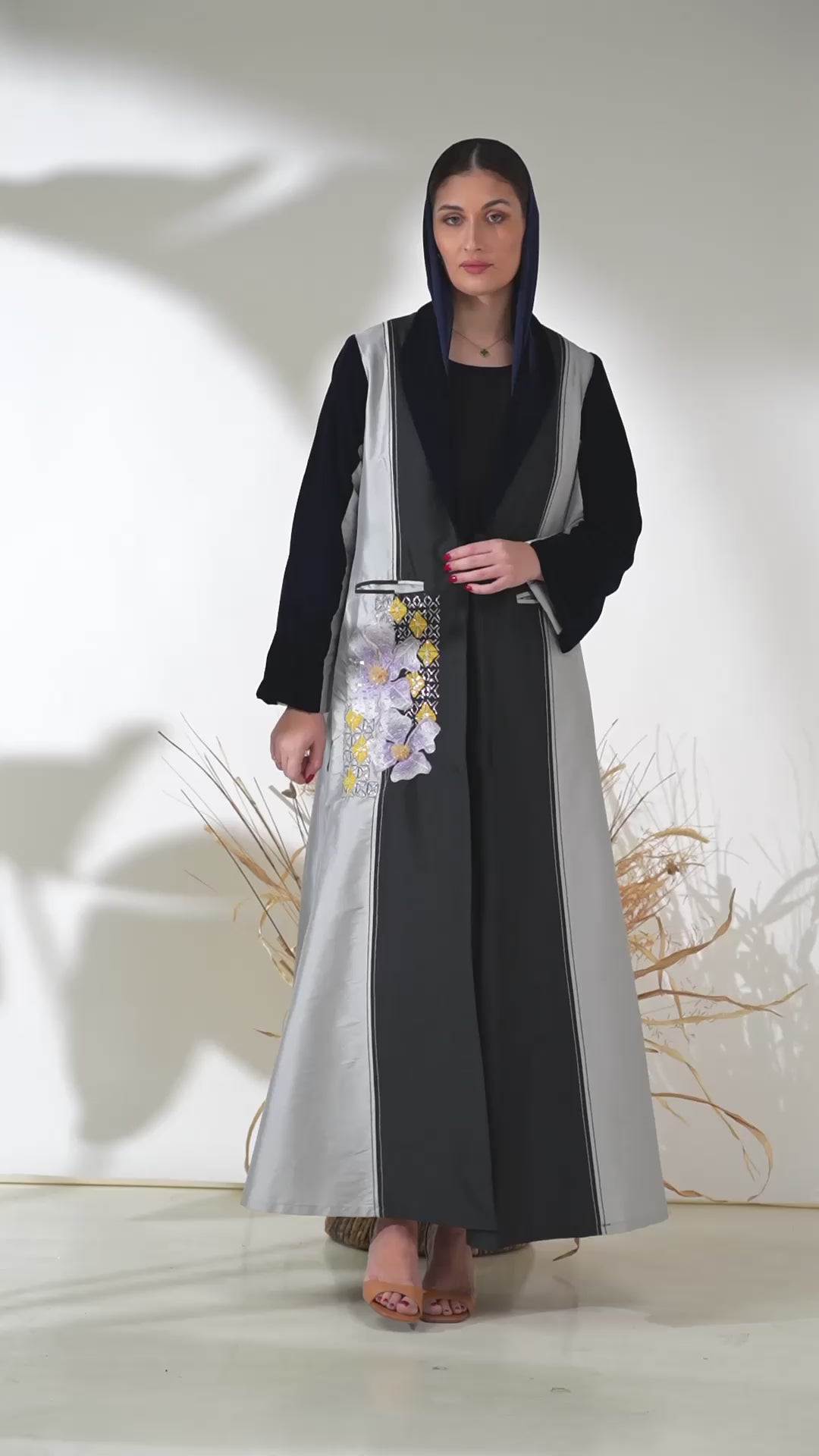 Silver Noir Panel Abaya with 3D Floral Appliqué & Velvet Details